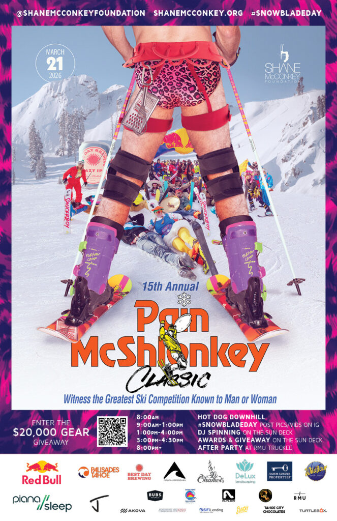 This epic day of camaraderie and general radness, is our annual celebration of Shane. We gather together to shred in his honor. Dressing in our most outrageous ski duds, and with snowblades waxed, we raise money for amazing causes. In 2026, we donated $10,000 to the Tahoe Nordic Search & Rescue who trek out in the most dangerous conditions to save lives, they are true heroes. And over $1M since our inception to over 50 nonprofits including the Humane Society of Truckee-Tahoe, Protect Our Winters, Gateway Mountain Center, Scotty Lapp Foundation, the Latinx scholarship program at Tahoe Truckee Community Foundation, and to support our EcoChallenge.